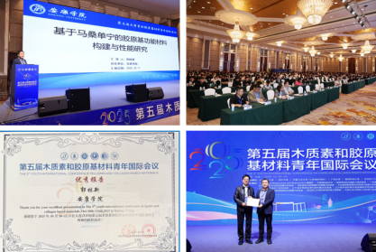 我院教师郭林新博士受邀参会,并作了题为《基于马桑单宁的胶原基功能材料构建与性能研究》的学术报告。报告系统介绍了我院科研团队在利用天然植物单宁—马桑单宁对胶原进行功能化改性方面的创新性研究成果,详细阐述了该材料在包装领域的优异性能与应用潜力。报告得到了与会同行的高度评价,获得“优秀报告”荣誉,有效提升了团队在该研究领域的学术影响力。