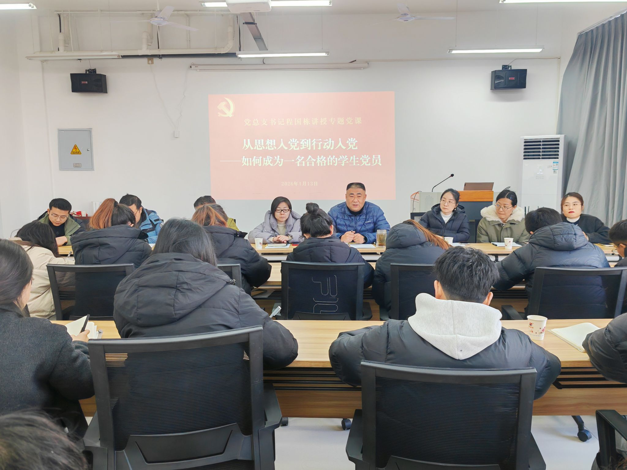 党总支书记程国栋以《从思想入党到行动入党:如何成为一名合格的学生党员》为题,为全体学生党员讲授专题党课。程国栋首先代表学院党总支对新转正党员和新接收的预备党员表示热烈祝贺。他指出,全体学生党员必须深刻理解“思想入党”的核心要义,不断强化理论武装、端正入党动机、提高政治能力,筑牢信仰之基。他强调,“行动入党”是检验党员先进性的“试金石”,学生党员应在勤奋学习、服务同学、锤炼品德、实践就业等各方面走在前、作表率,将思想的先进性转化为实实在在的先锋模范行动。他要求全体党员要努力实现思想与行动的有机统一,以思想自觉引领行动自觉,以行动实效检验思想纯度,在持续修炼中实现党性修养的螺旋式上升,真正做到知行合一。