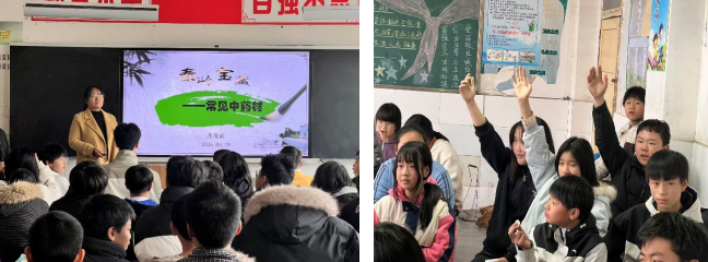 “秦地无闲草,自古多名药。”在四合九年制学校,花俊丽老师借助精美图片,围绕天麻、杜仲、绞股蓝、木瓜等安康道地药材,从外观性状、药用价值、日常保健小偏方,到药名背后的神奇传说,为同学们带来生动有趣的科普讲解。同学们认真听讲,对中药材充满好奇与向往。课堂上,老师还通过有奖抢答的形式,鼓励大家分享自己认识的中药材,现场气氛热烈、互动踊跃。